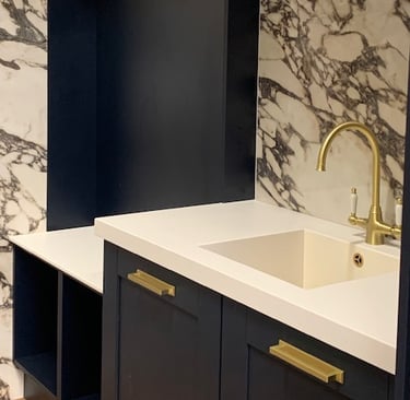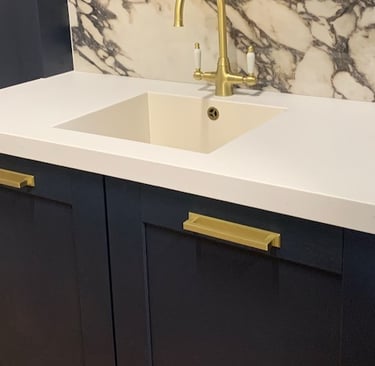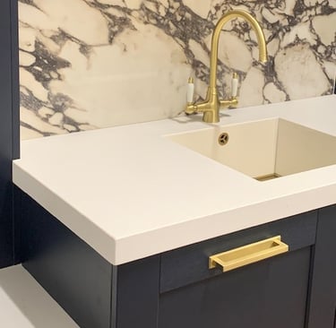 What sets this project apart is the precision with which we moulded the Corian® around the 1810 Gold Brass Axix sink, creating a flawless integration between surface and basin. The result is a truly custom look that’s easy to maintain and a joy to use.