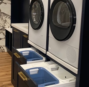 By installing Bosch washing and drying appliances at a raised height, we’ve made the daily laundry routine more comfortable, reducing the need to bend or kneel. This ergonomic choice blends perfectly with the cabinetry and sits above two deep pull-out laundry drawers, ideal for separating colours or storing baskets neatly out of sight.