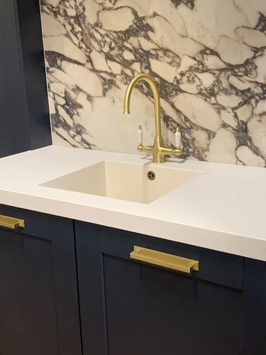 Above the sink, a twin-lever brushed brass tap mirrors the tones of the brass handles and the Axix sink. This continuity in material choices helps tie the room together visually, creating a calm, unified palette. The tap was installed with care to maintain the clean geometry and unbroken lines of the surface below.