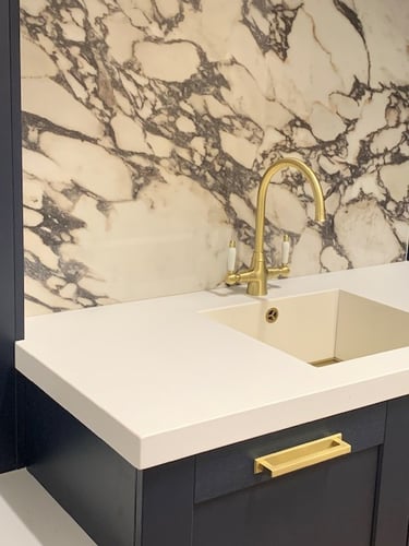 One of the most carefully considered elements of this project was the fusion between the Corian® worktop and the Xtone splashback. The fabrication was measured and detailed to ensure the Corian® transitions seamlessly into the back wall, meeting the Calacatta Viola with zero visual disruption. The result is a subtle but powerful design statement: organic and modern, bold yet balanced.
