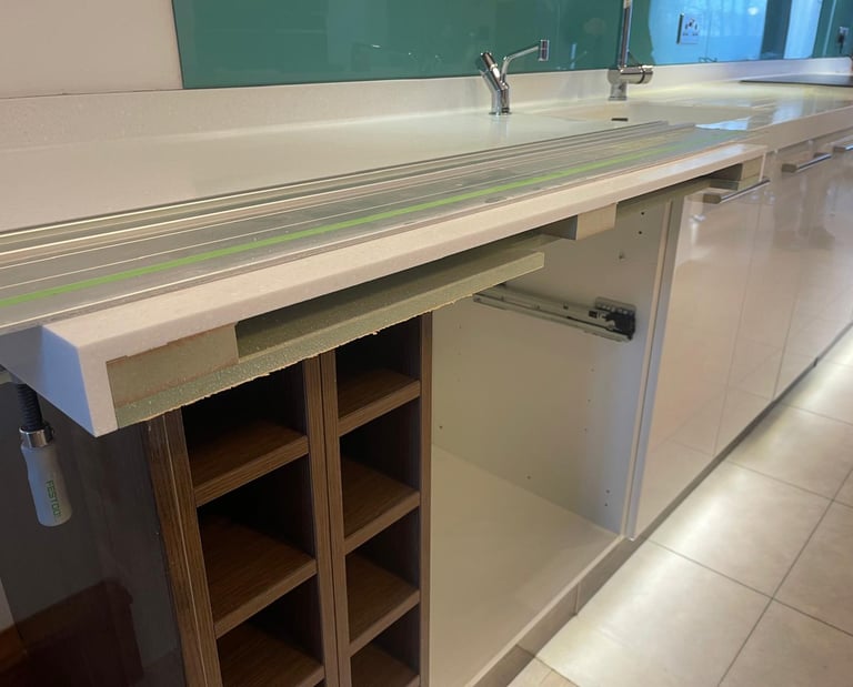 Instead of discarding the existing Corian worktops, we skillfully repurposed them. To ensure a flawless finish, our team carried out a full repair and repolish of the surfaces, bringing them back to their original brilliance. This sustainable approach saved the client money while reducing material waste.
